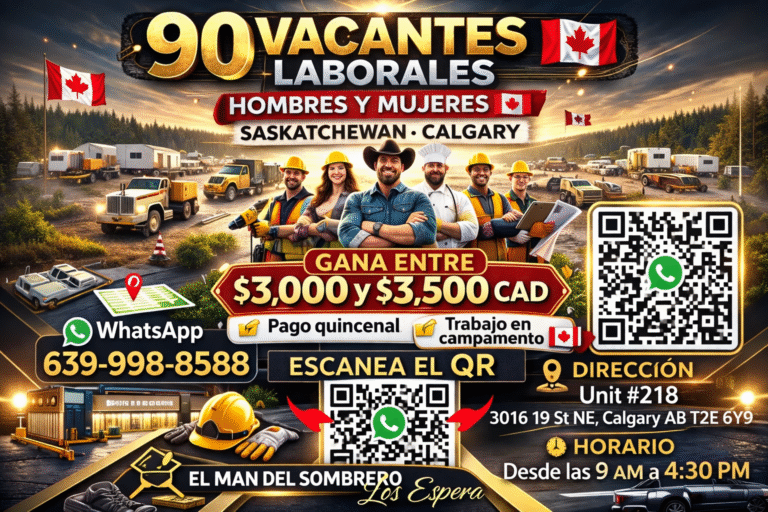 🔴 90 VACANTES LABORALES HOMBRES Y MUJERES SASKATCHEWAN · CALGARY 💰 GANA ENTRE $3,000 y $3,500 CAD 📱 WhatsApp 💵 Pago quincenal 🏕️ Trabajo en campamento 📞 639-998-8588 📍 DIRECCIÓN: Unit #218 3016 19 St NE, Calgary AB T2E 6Y9👨 EL MAN DEL SOMBRERO 🕒 Desde las 9 AM a 4:30 PM